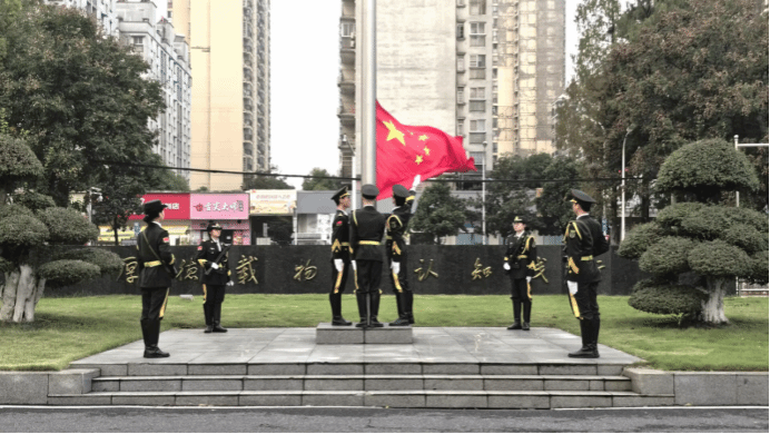 主持人康昭宣布升旗仪式正式开始。随着指挥员的口令,护卫队踏着《分列式进行曲》的节拍,迈出了第一步。他们的步伐铿锵有力,手臂前后摆动,角度精准划一。擎旗手右臂扬起,五星红旗被展向空中,迎风展开。 国歌奏响,全体师生行注目礼。