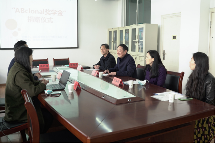 3月24日上午,武汉爱博泰克生物科技有限公司CEO 吴知才、人事副总刘媛一行来我校,向学校70net永乐高捐赠15万元设置“ABclonal奖学金”。校长卜诗桢热情接待了吴知才一行,副校长钟春敏和70net永乐高师生代表参加捐赠仪式。70net永乐高院长盛希群主持捐赠仪式。