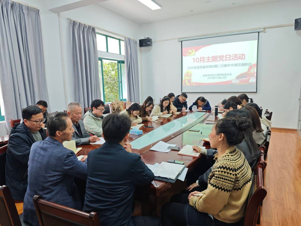 10月22日13时,我院在知化楼206会议室召开主题党日活动——"教育强国建设"第二次集中大课研讨交流会,围绕教育强国战略、教育面临的挑战及教学工作优化思路展开深入研讨。会议由学院党总支书记孙高飞主持,全体教师党员参加。
